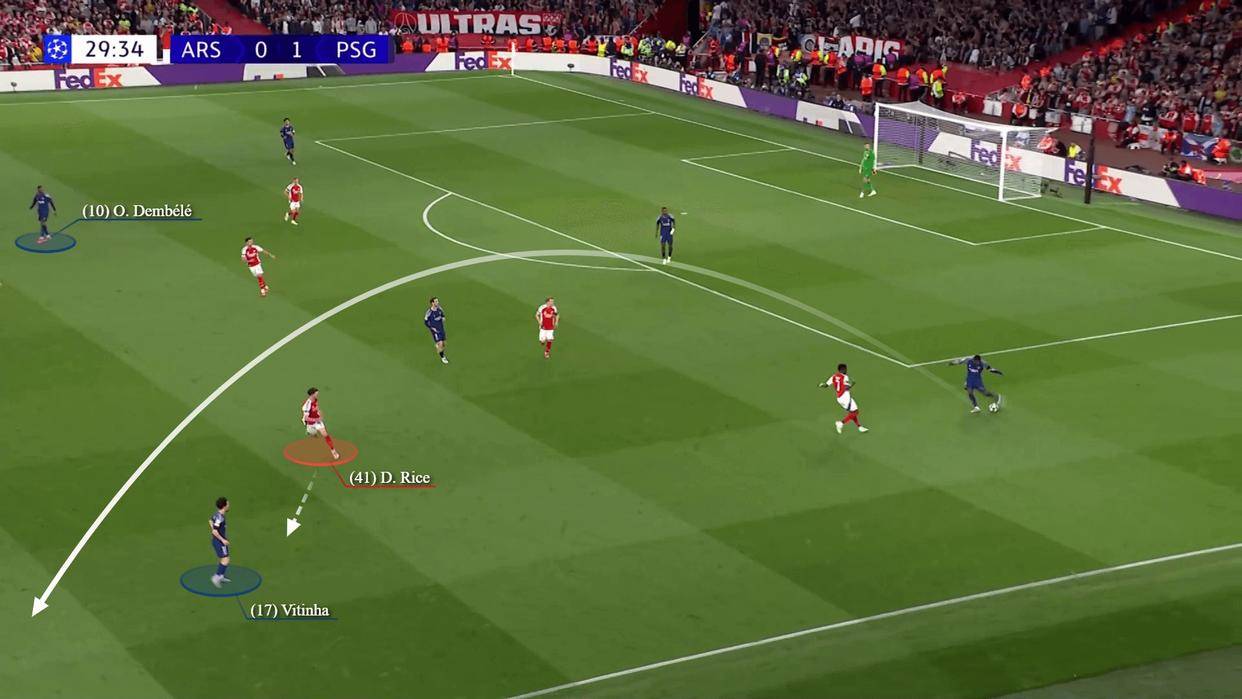 萨卡逼近门德斯,此时法比安-鲁伊斯站位拉边,将赖斯从中场位置吸引开。门德斯把球传到赖斯离开后空出的区域,交给回撤的登贝莱。